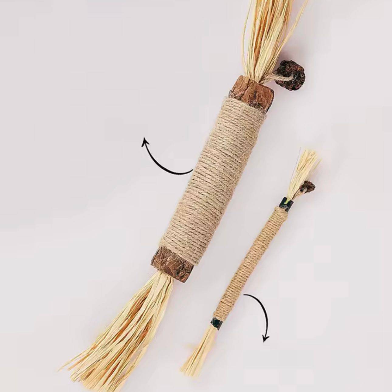 Este modelo no solo incluye el palito de matatabi, los componentes adicionales tienen los siguientes beneficios: el matatabi ayuda a relajar y limpiar sus dientes, el sisal rope ofrece una textura perfecta para morder y rascar, la gallnut contribuye a la salud bucal, la raffia despierta su instinto cazador y la silvervine lo hace aún más irresistible.